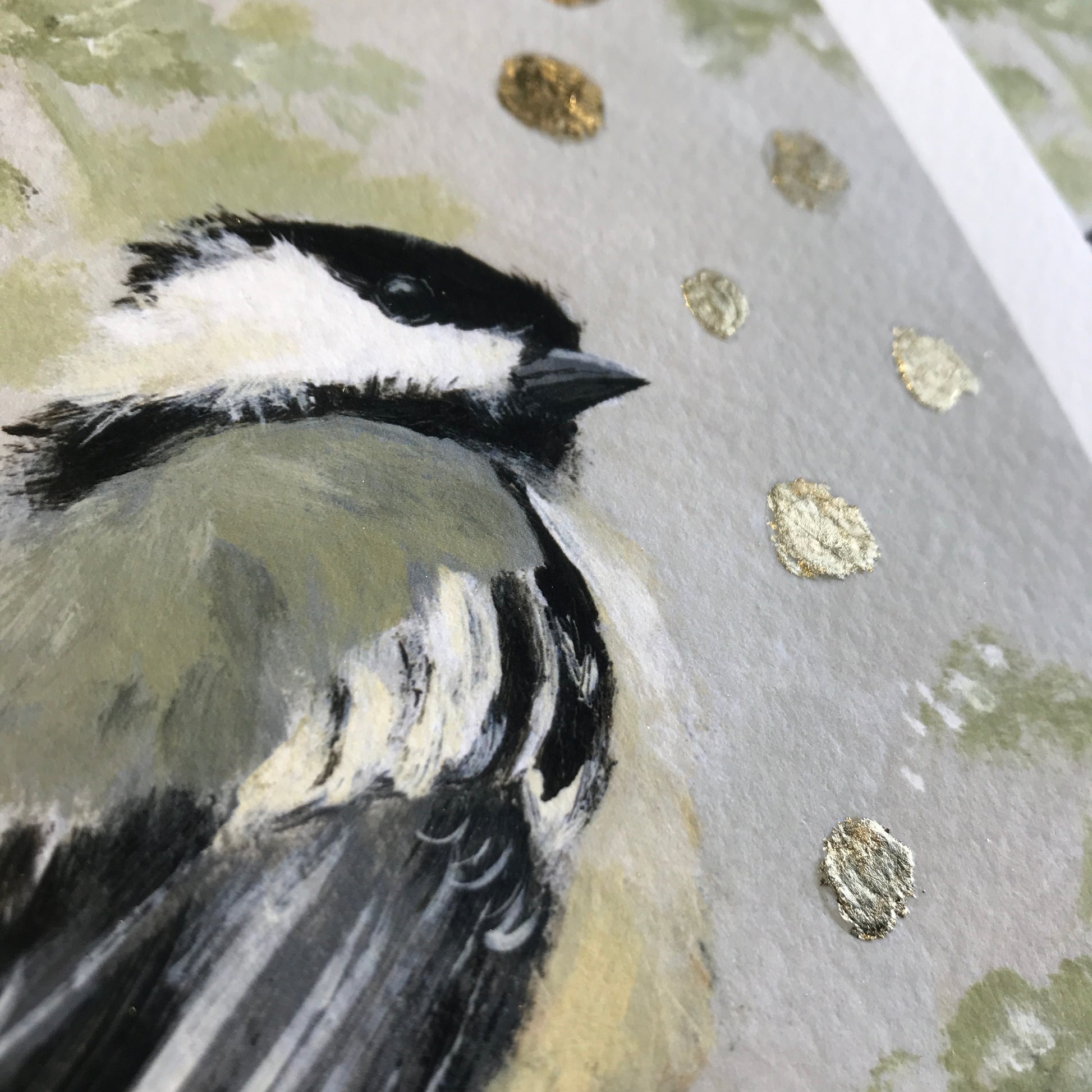 If you love gold leaf sparkles and sweet chickadees, I created a limited edition series of only five hand-embellished prints, 5 x 7 inches, printed on museum-quality watercolor bright white paper.