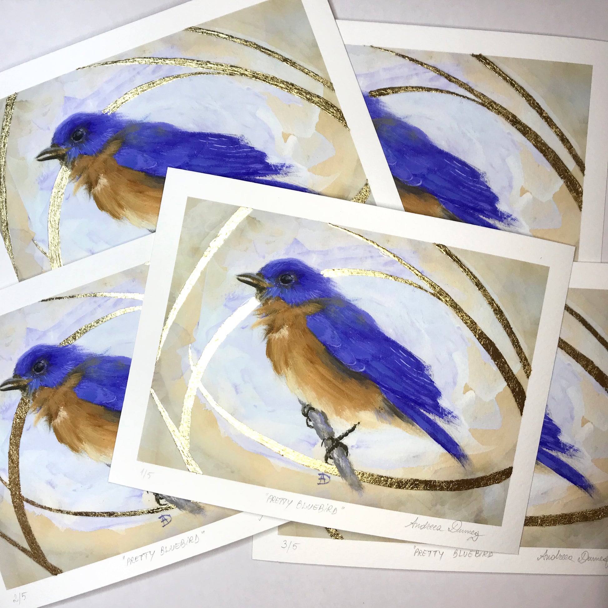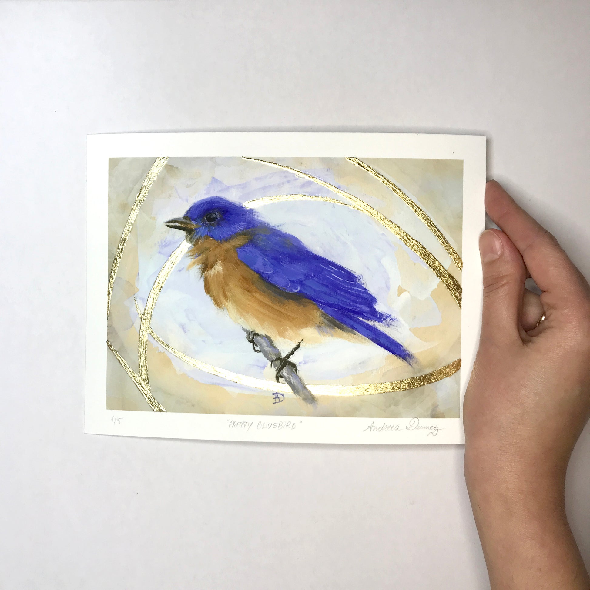 If you love gold leaf sparkles and pretty bluebirds, I created a limited edition series of only five hand-embellished prints, 5 x 7 inches, printed on museum-quality watercolor bright white paper.